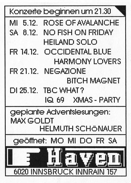 1990-01-05_haven_urfahrer durchbruch_2    1990-01-05_haven_urfahrer durchbruch_1    1990-01-29_haven_uk subs    1990-02-02_haven_occidental blue harmony lovers_no budget_u-cover    1990-02-03_haven_contro potere    1990-02-08_haven_kitchens of distinction_1    1990-02-08_haven_kitchens of distinction_2    1990-02-08_haven_kitchens of distinction_3    1990-02-08_haven_g-verbot_lost braincells_tbc what    1990-02-09_haven_g-verbot_tbc what_1    1990-02-09_haven_g-verbot_tbc what_2    1990-02-10_haven_hearing    1990-02-24_haven_groupieball    1990-03-02_haven_legendary pink dots    1990-03-10_haven_acoustic rape_chaos f    1990-03-12_haven_giant sand    1990-03-16_haven_target of demand_tbc what_1    1990-03-16_haven_target of demand_tbc what_2    1990-04-06_haven_g-verbot_40 unknown_fuckhead_trottel    1990-04-15_haven_hass_kurort_acoustic rape    1990-05-02_haven_contro potere_schlacht    1990-05-05_haven_loda_navajo_enne_egger    1990-05-19_haven_basket_nichts_new age    1990-06-08_haven_seven sioux_krueppelschlag_kurort    1990-06-09_haven_ronni urini_1    1990-06-09_haven_ronni urini_2    1990-07-06_haven_dsl_louis brown-enne_1    1990-07-06_haven_dsl_louis brown-enne_2    1990-09-08_haven_dancefloornight    1990-09-22_haven_tonart studio eroeffung    1990-09-29_haven_enne    1990-10-07_haven_bomb_suzi chream cheese_1    1990-10-07_haven_bomb_suzi chream cheese_2    1990-10-07_haven_programm_native soil    1990-10-16_haven_iep    1990-11-02_haven_stand to fall_fuckhead    1990-11-10_haven_diderot_ibk sampler_1    1990-11-10_haven_diderot_ibk sampler_2    1990-11-17_haven_programm    1990-11-28_haven_doughboys_haewi maedels    1990-12-01_haven_rave    1990-12-05_haven_programm    1990-12-06_haven_programm    1990-12-06_haven_rose of avalanche    1990-12-08_haven_no fish on friday_heiland    1990-12-21_haven_bitchmagnet    1990-12-31_haven_automata felhivas_pankomat_acoustic rape    1991-06-15_haven_diderot_tbc what_blitzgemetzel_refpiz_no boundaries    1991-08-14_haven_automata felhivas_lost braincells